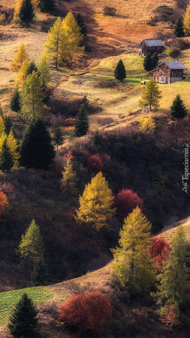 Edytor tapety: Domki i kolorowe drzewa na pagórkach