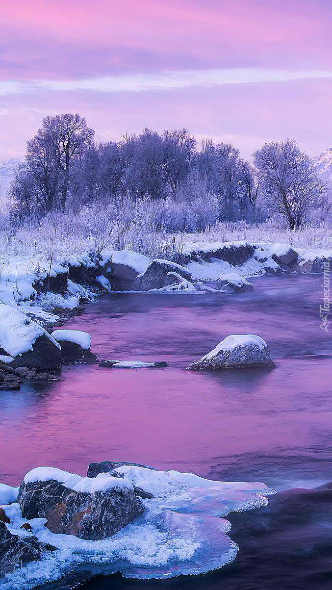 Edytor tapety: Zima nad rzeką o zachodzie słońca