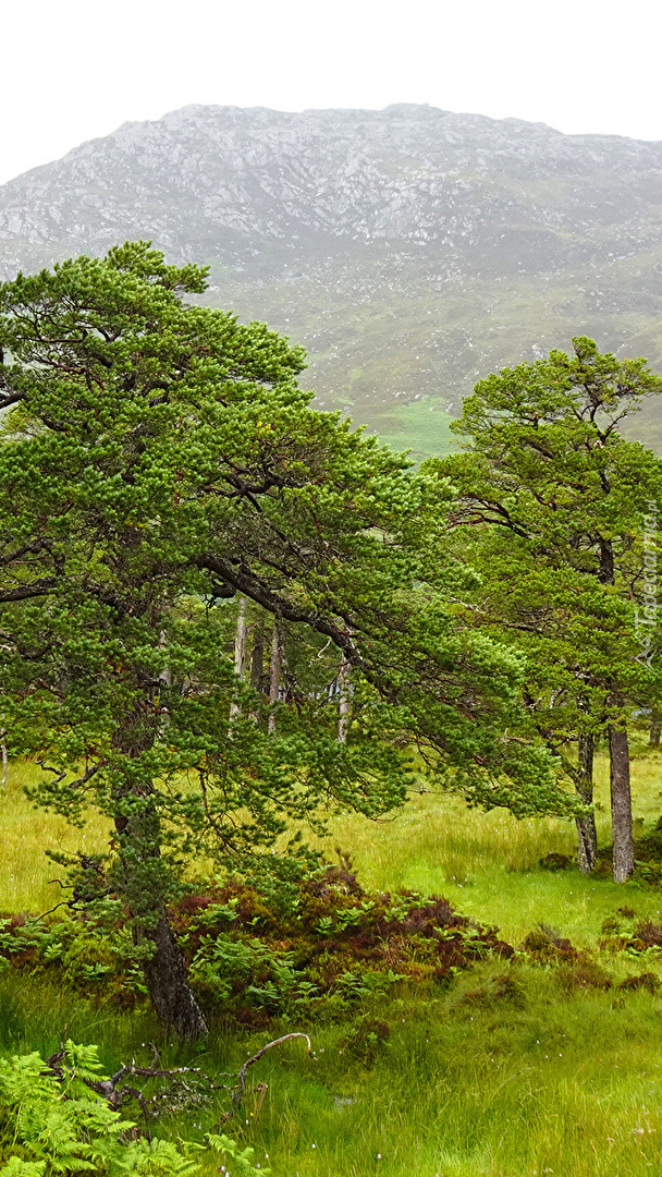 Edytor tapety: Zielone drzewa na tle góry