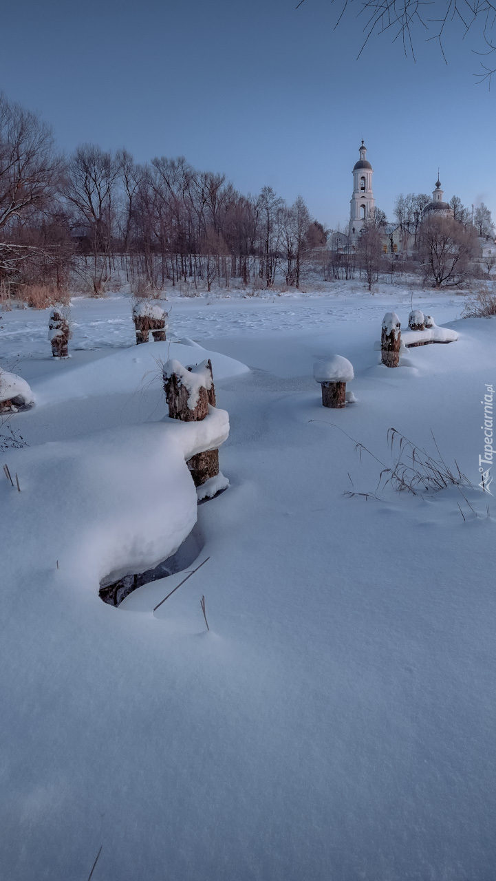 Edytor tapety: Ośnieżone kołki i cerkiew w tle