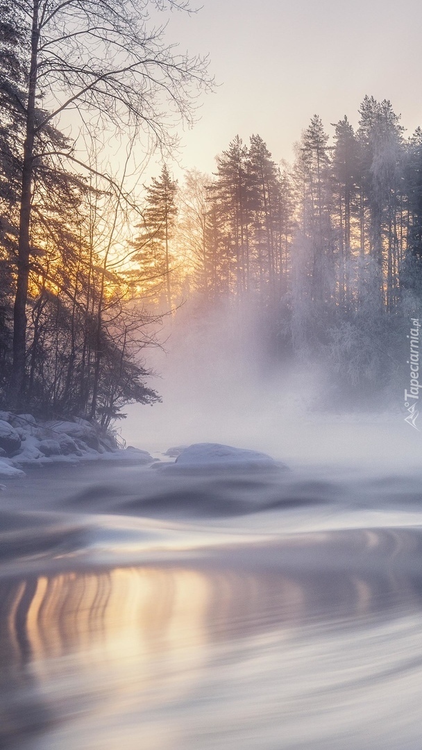 Edytor tapety: Ośnieżone drzewa nad zamgloną rzeką