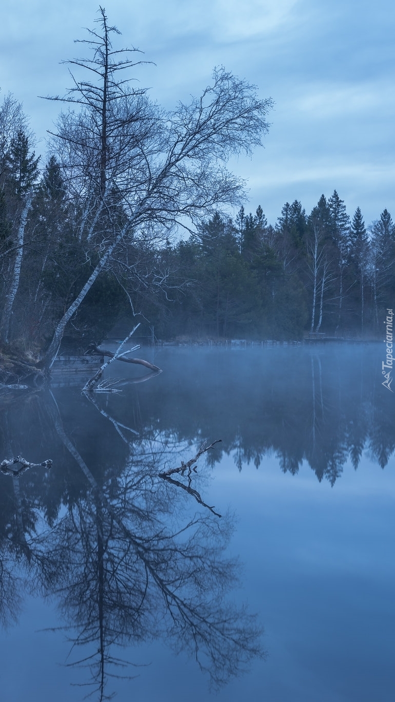 Edytor tapety: Las nad brzegiem rzeki we mgle