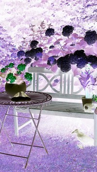 Edytor tapety: Ławeczka i stolik przy krzewie kaliny koralowej