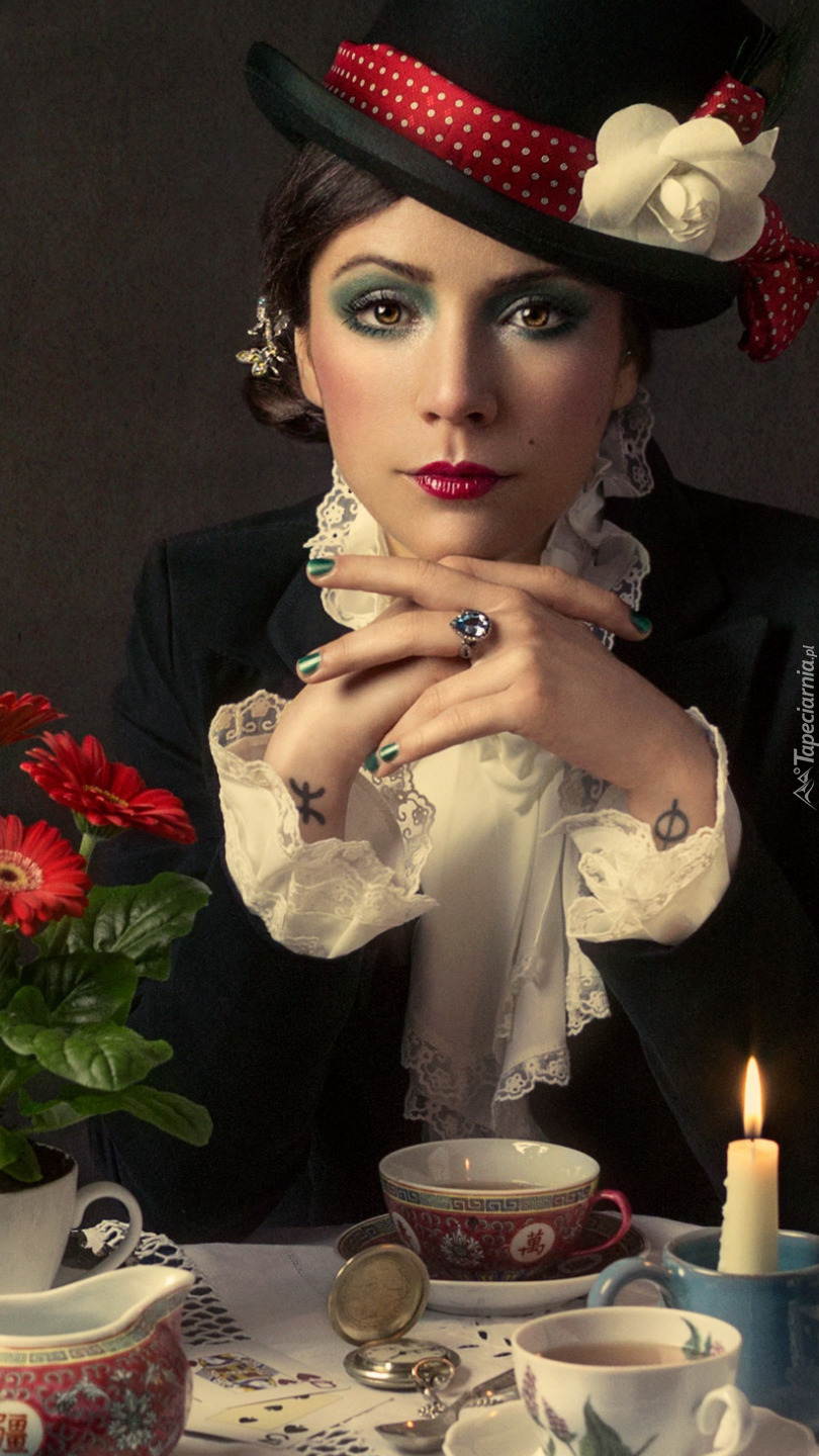 Edytor tapety: Kobieta w kapeluszu przy stole