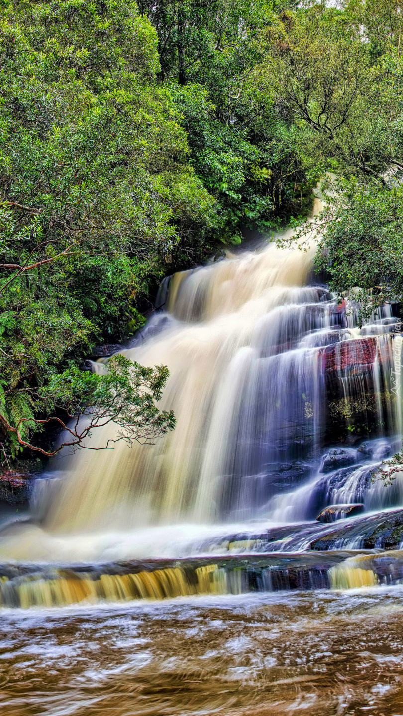 Edytor tapety: Kaskadowy wodospad wśród drzew