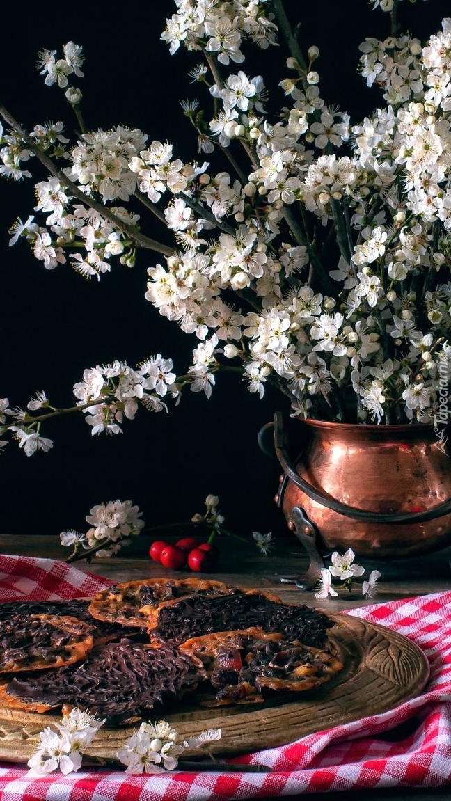 Edytor tapety: Kwitnące gałązki drzewa owocowego obok florentynek