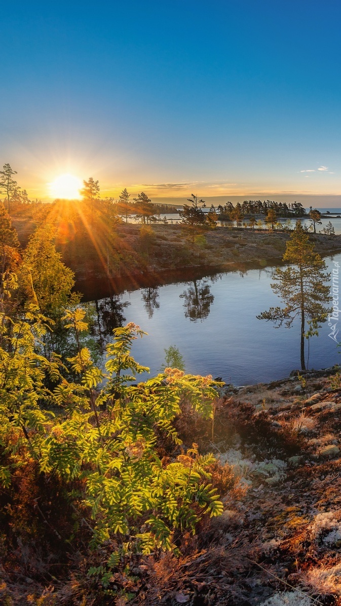 Edytor tapety: Wschodzące słońce nad jeziorem