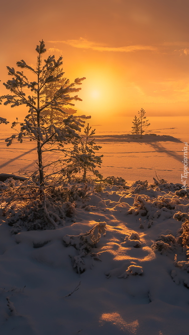 Edytor tapety: Zaśnieżone drzewa i jezioro