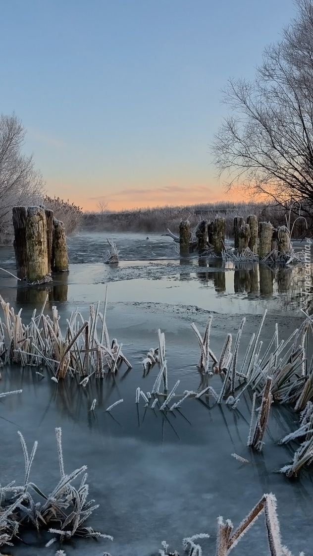 Edytor tapety: Oszronione kołki i rośliny w rzece