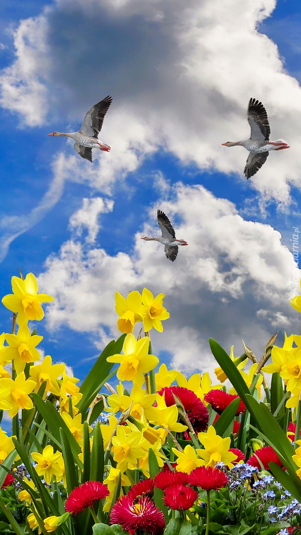 Edytor tapety: Gęsi nad wiosennymi kwiatami