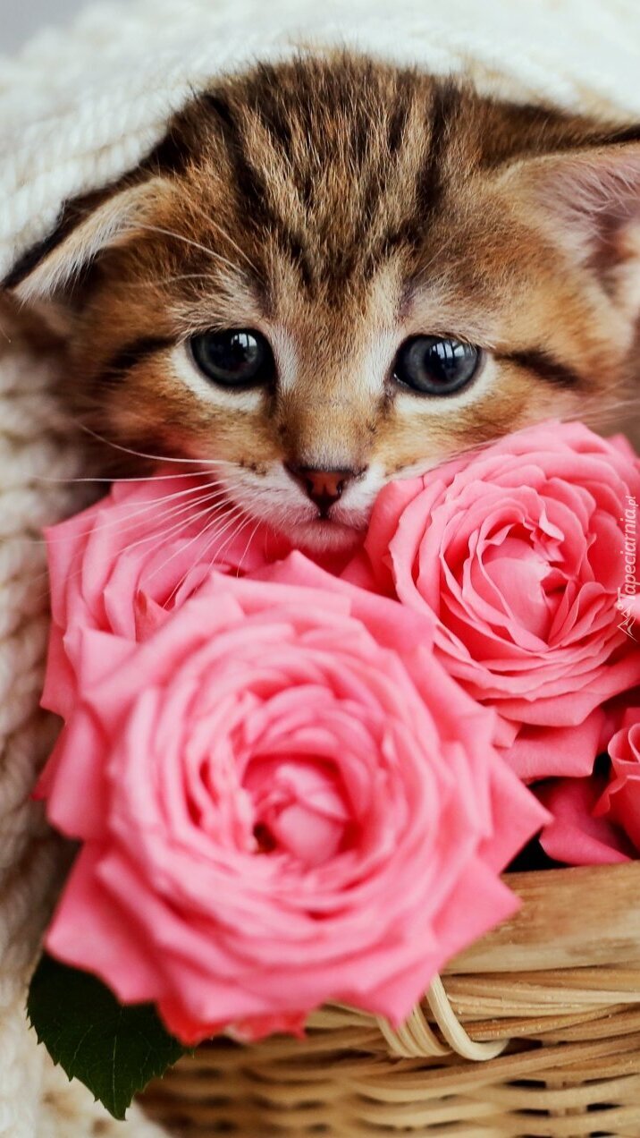 Edytor tapety: Mały kotek i róże w koszyku