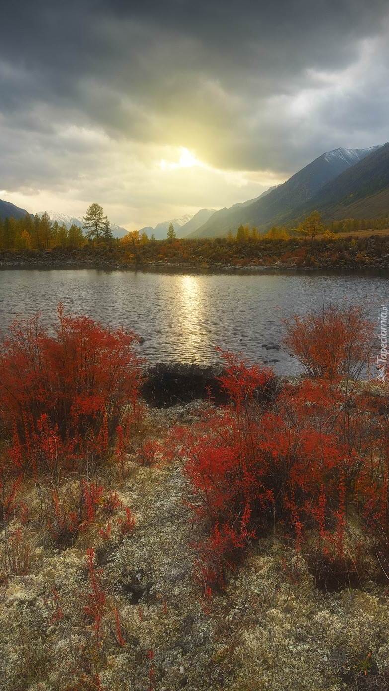 Edytor tapety: Czerwone rośliny nad brzegiem rzeki