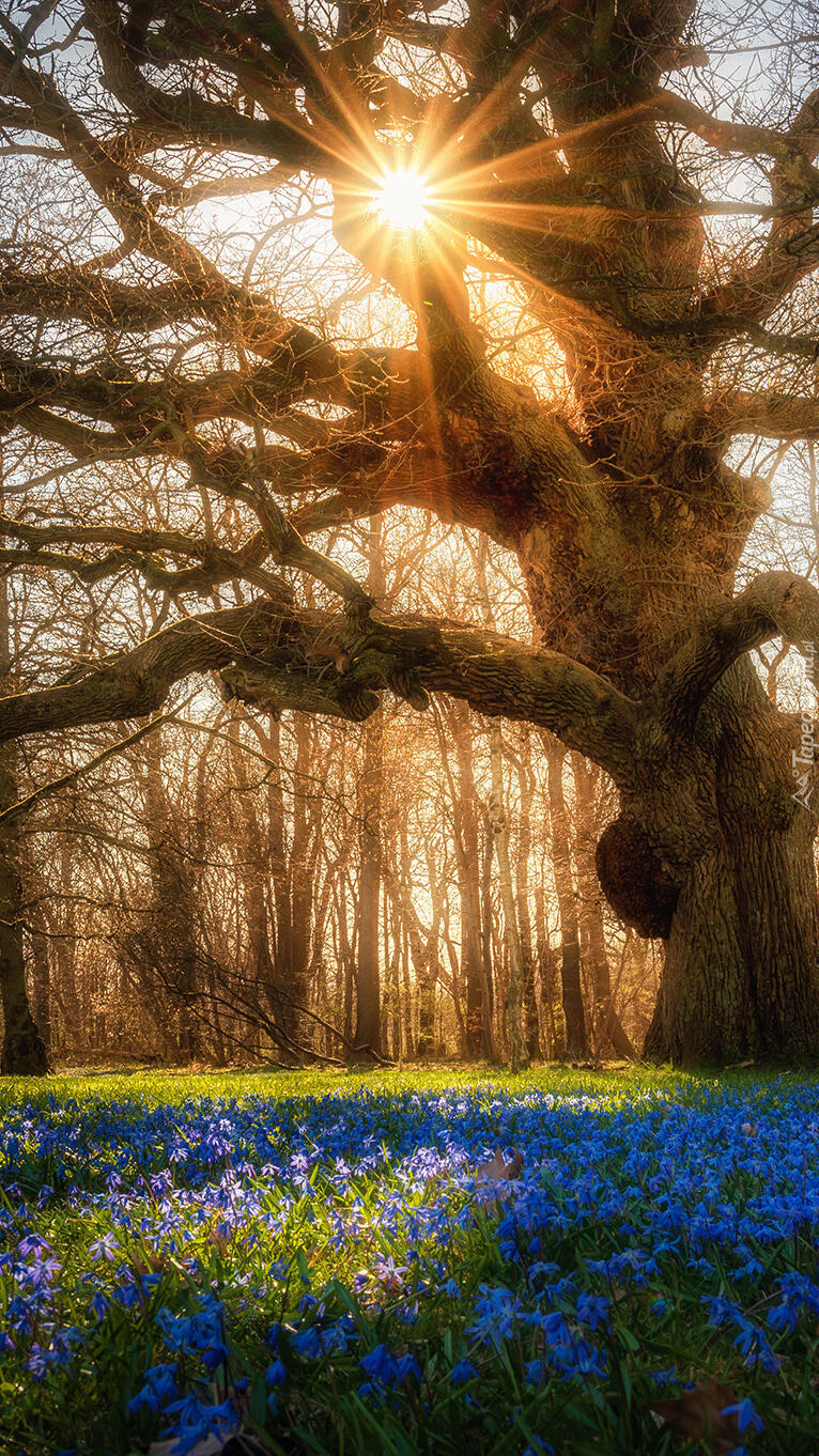 Edytor tapety: Niebieskie kwiaty pod rozłożystym drzewem