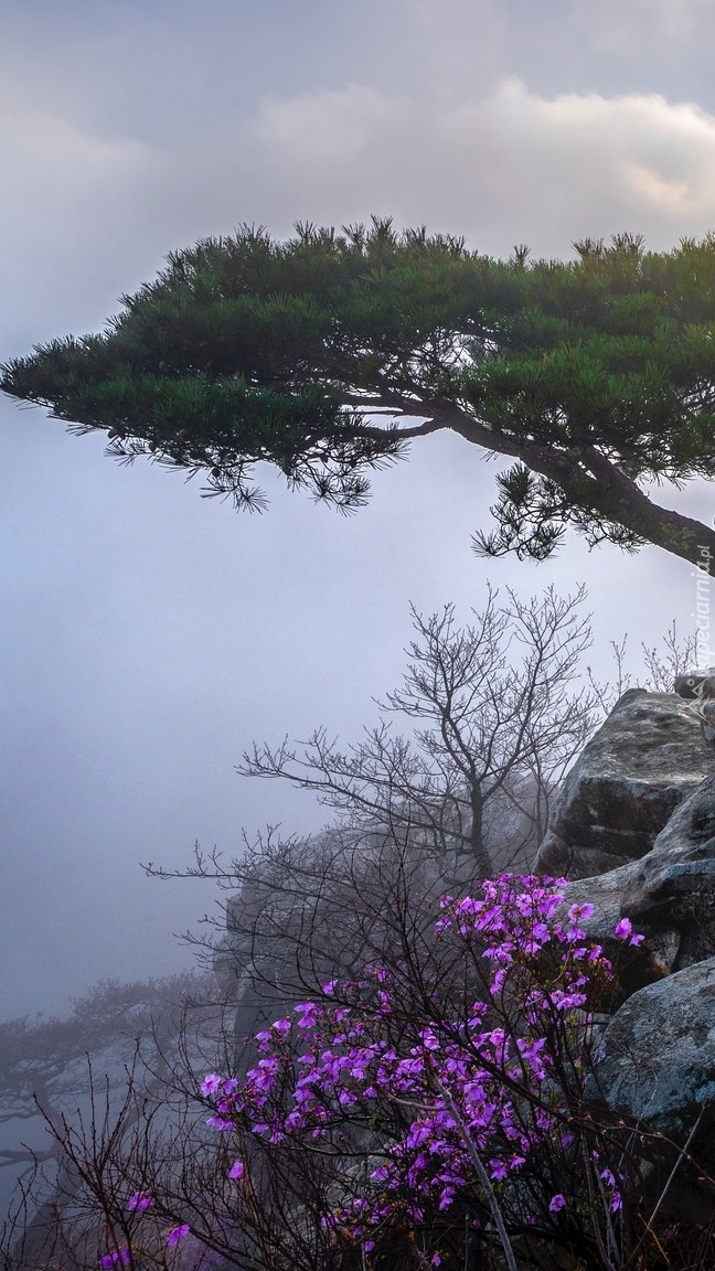 Edytor tapety: Sosna i kwiaty na skale