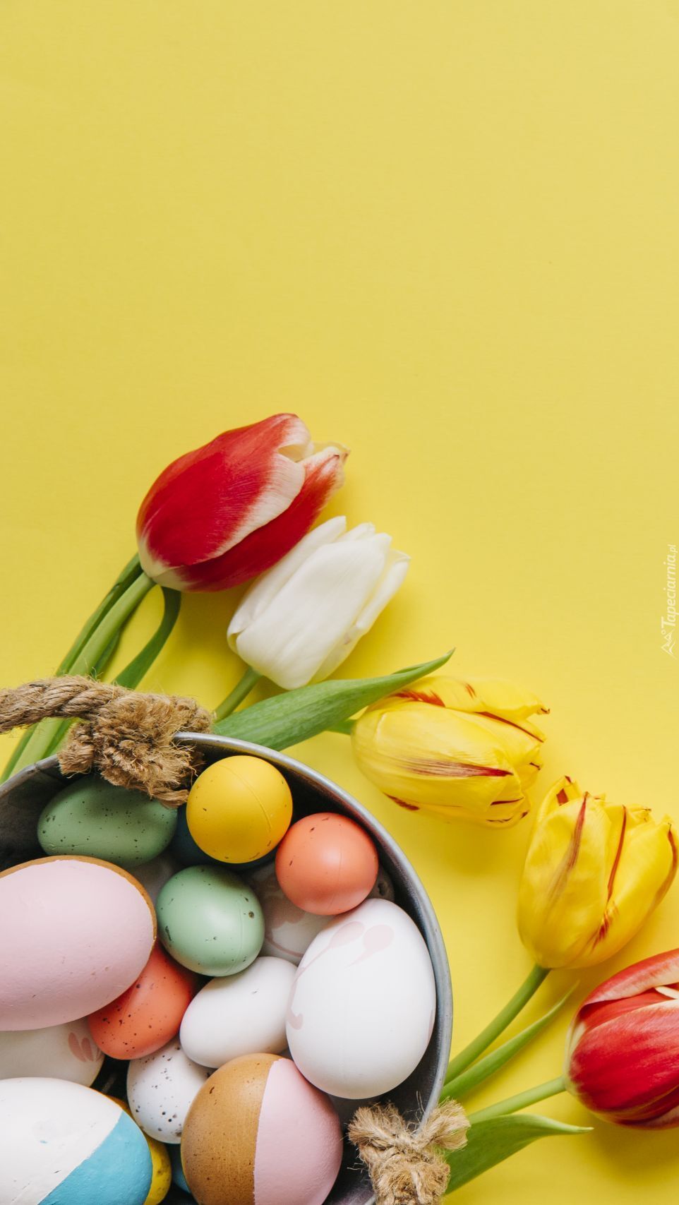 Edytor tapety: Tulipany obok pisanek w wiaderku