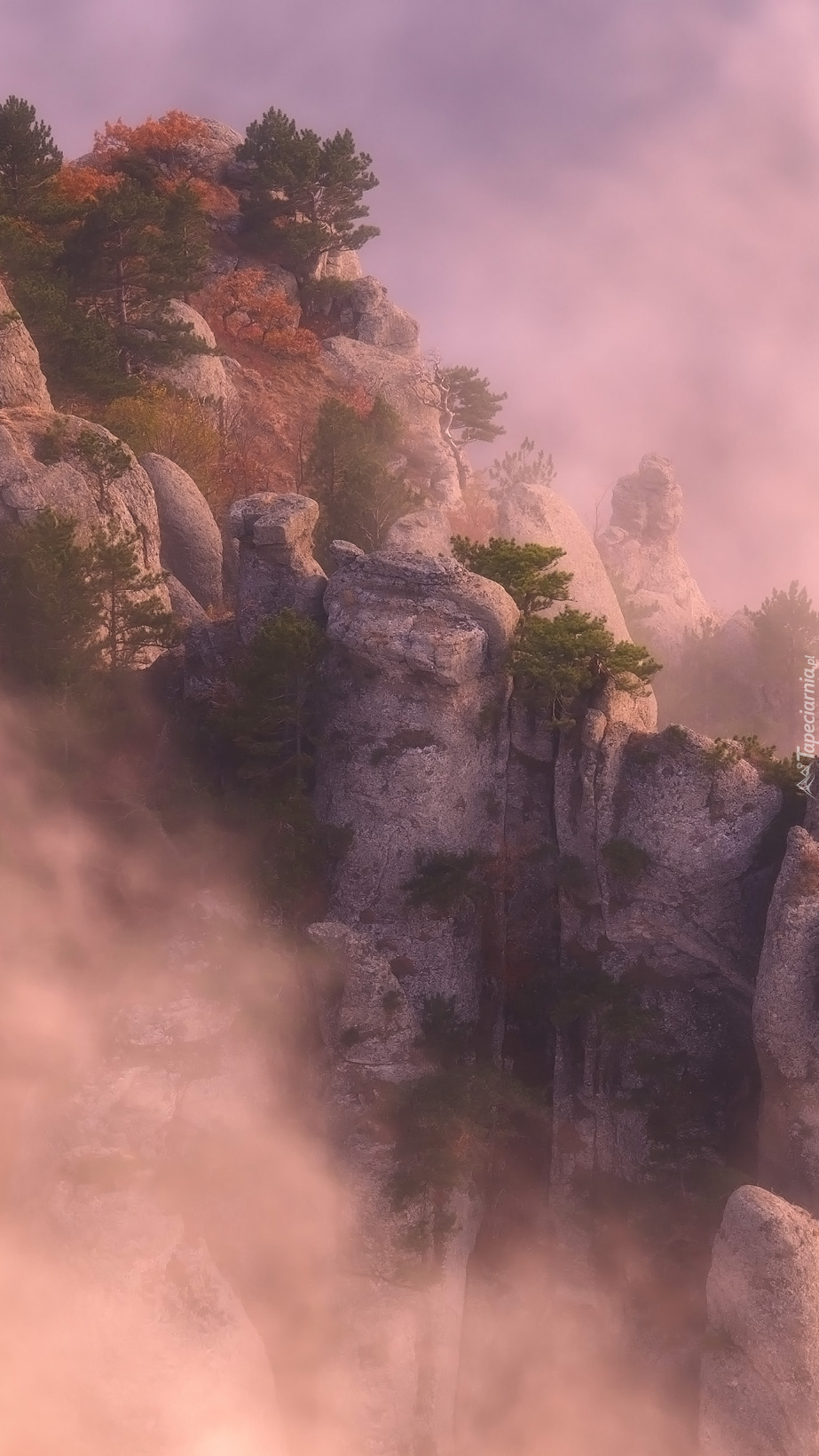 Edytor tapety: Drzewa na skałach we mgle