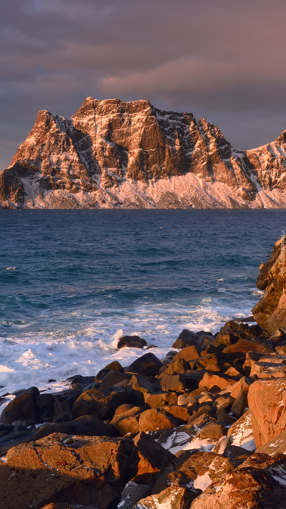 Edytor tapety: Rozświetlone góry i skały nad morzem