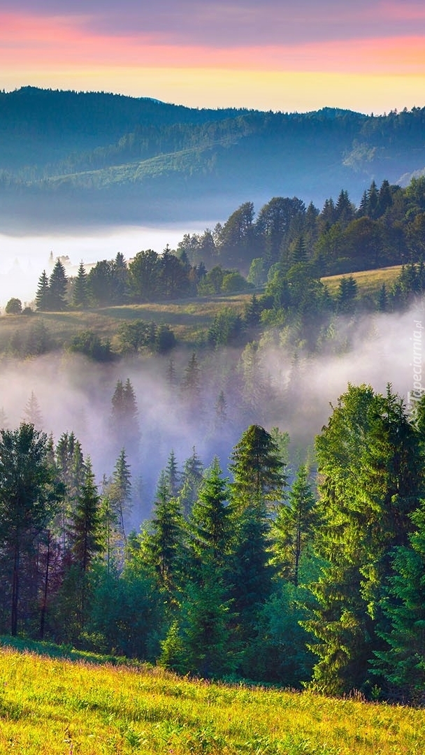 Edytor tapety: Poranna mgła nad lasem