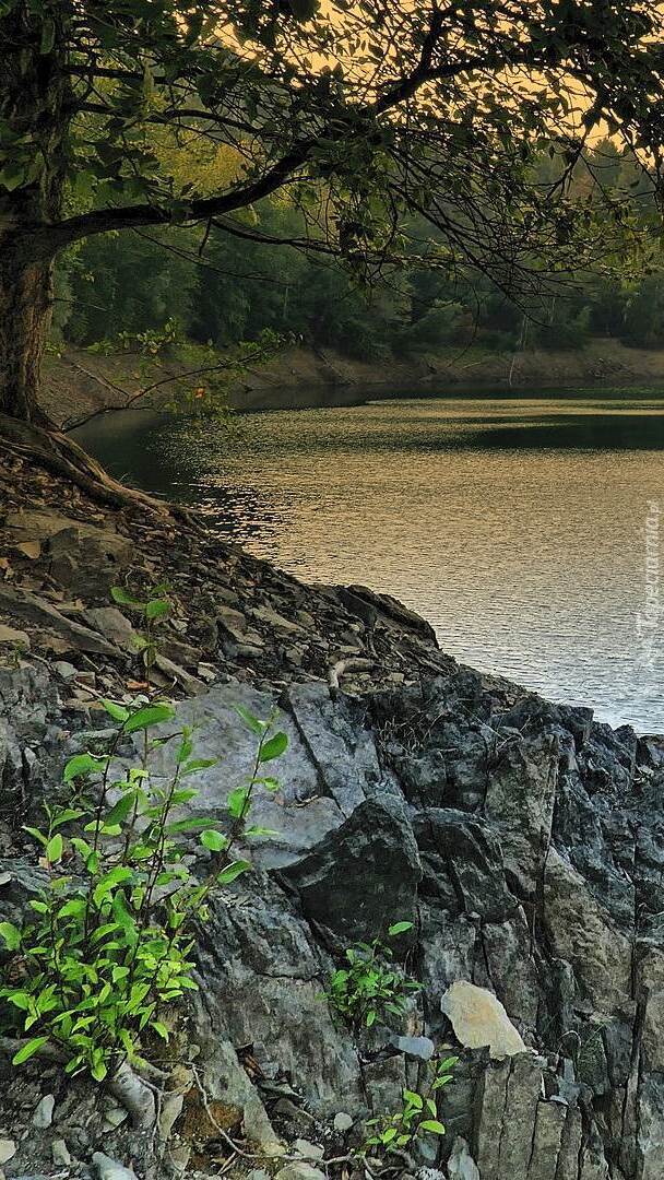 Edytor tapety: Drzewo na skałach nad jeziorem