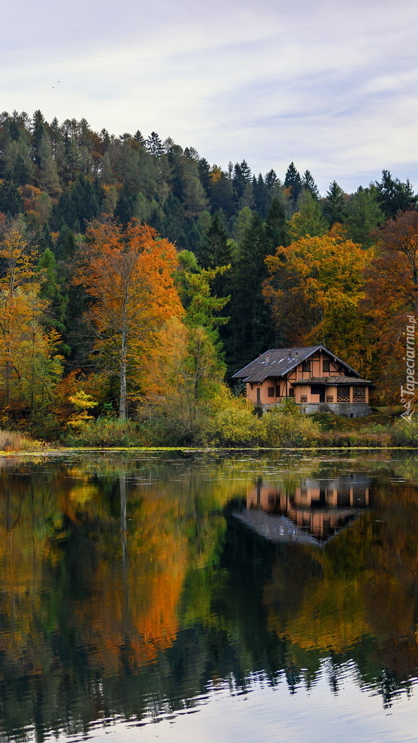 Edytor tapety: Dom wśród jesiennych drzew nad jeziorem