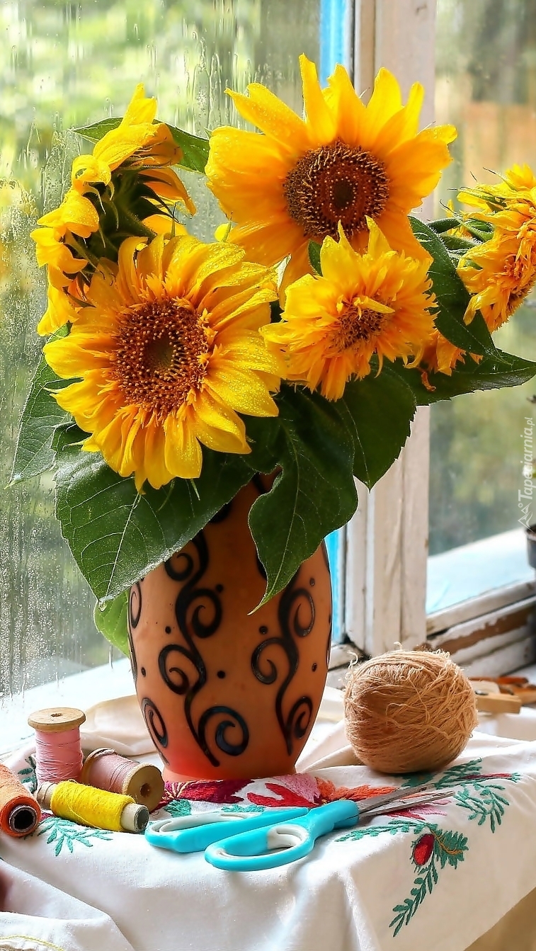 Edytor tapety: Słoneczniki na parapecie przy oknie