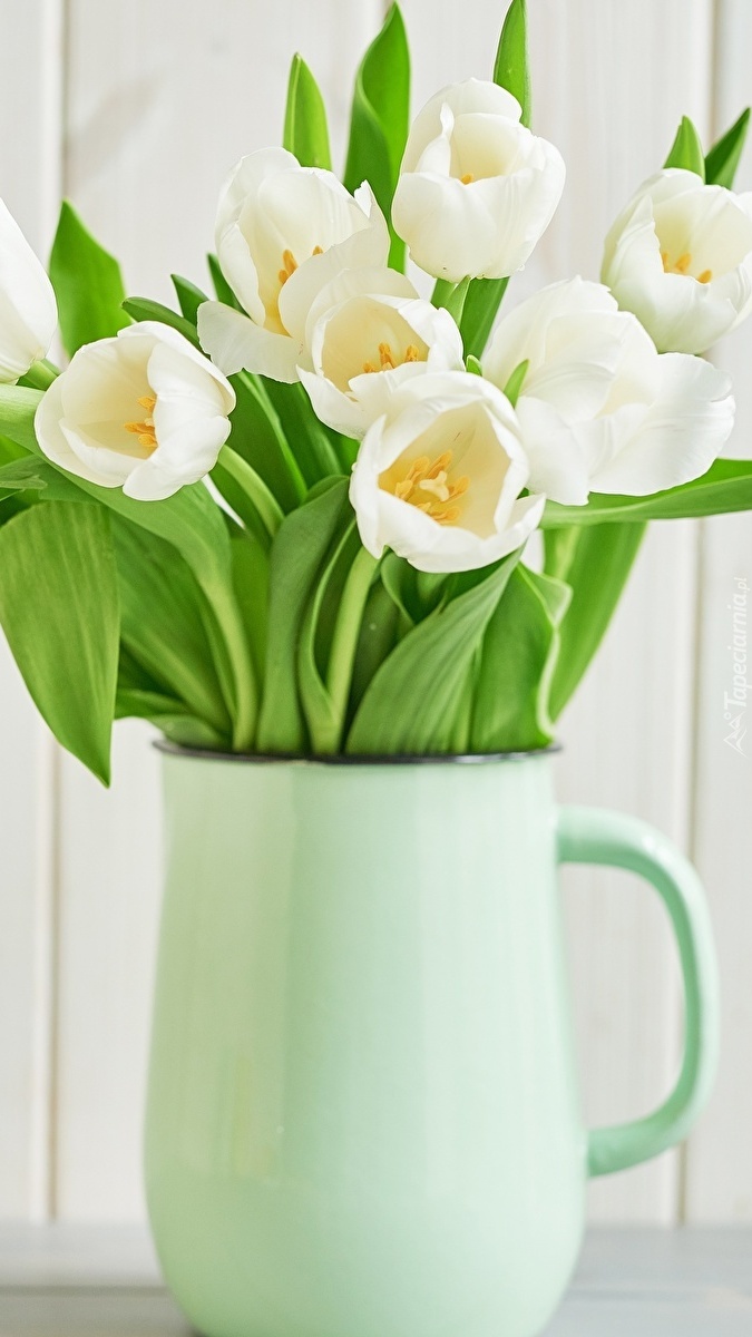 Edytor tapety: Białe tulipany w dzbanku