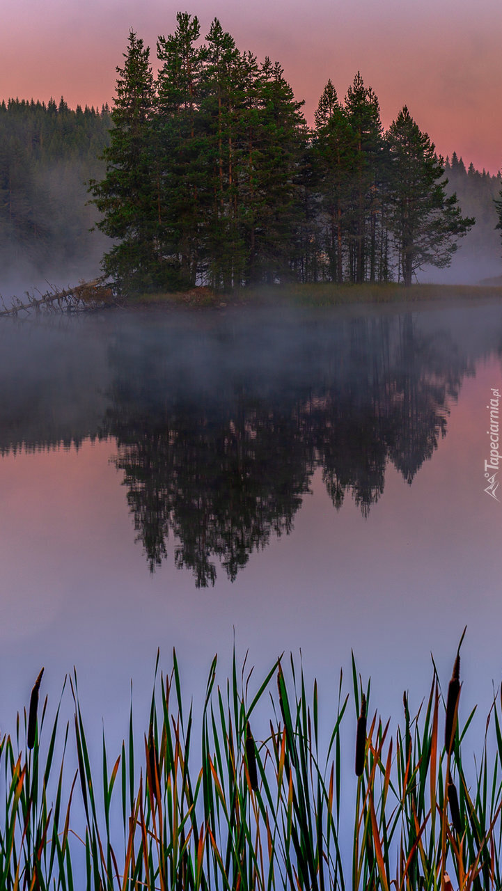 Edytor tapety: Drzewa nad zamglonym jeziorem
