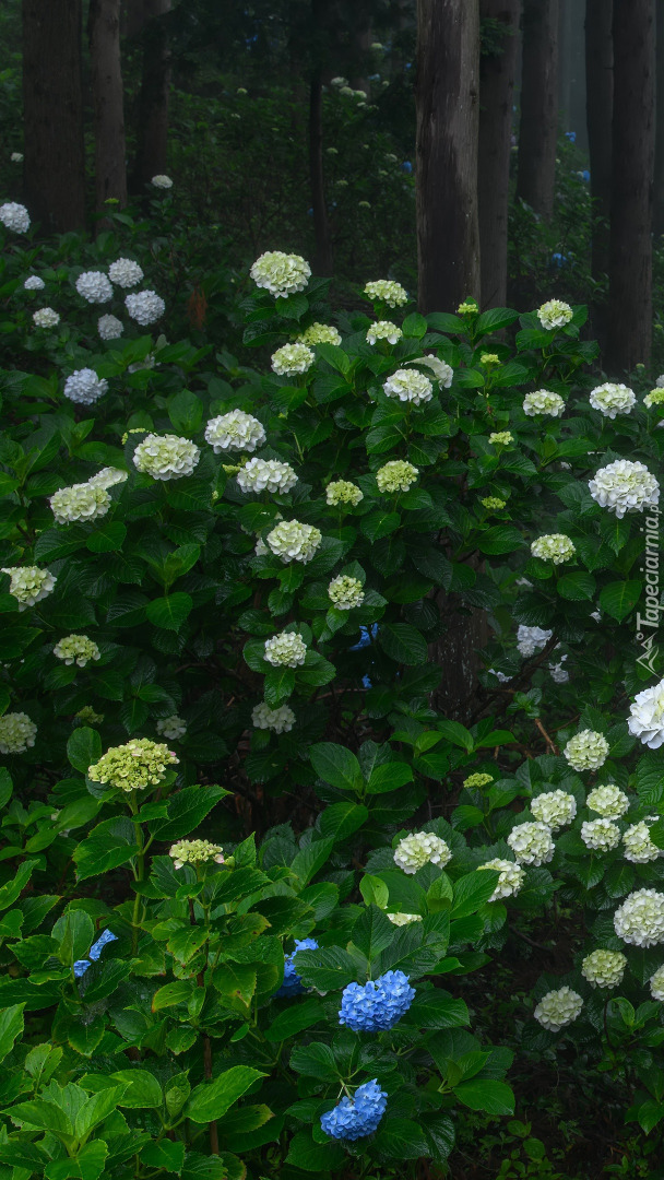 Edytor tapety: Kolorowe hortensje pod drzewami