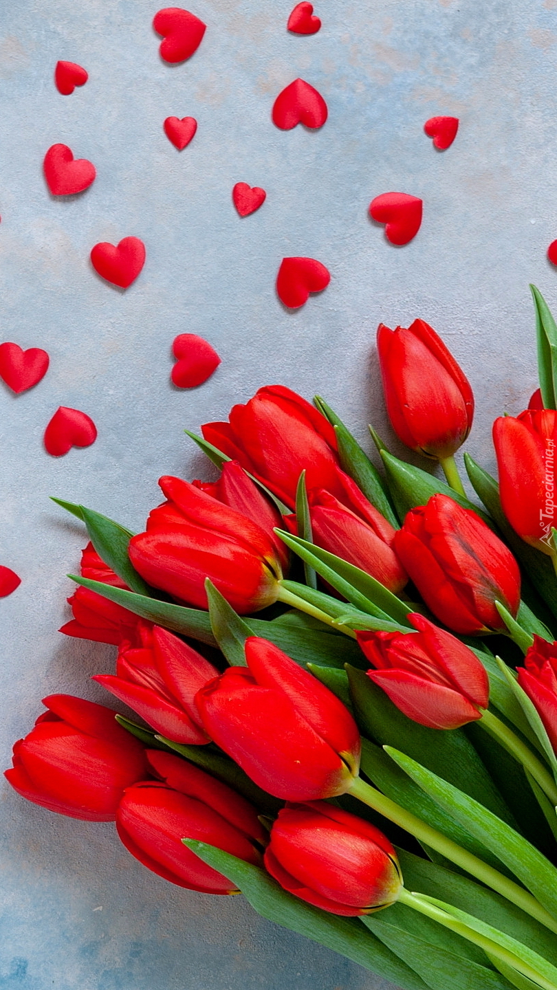 Edytor tapety: Serduszka obok czerwonych tulipanów