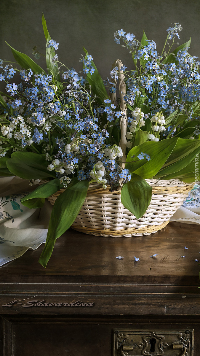 Edytor tapety: Kosz z niezapominajkami i konwaliami