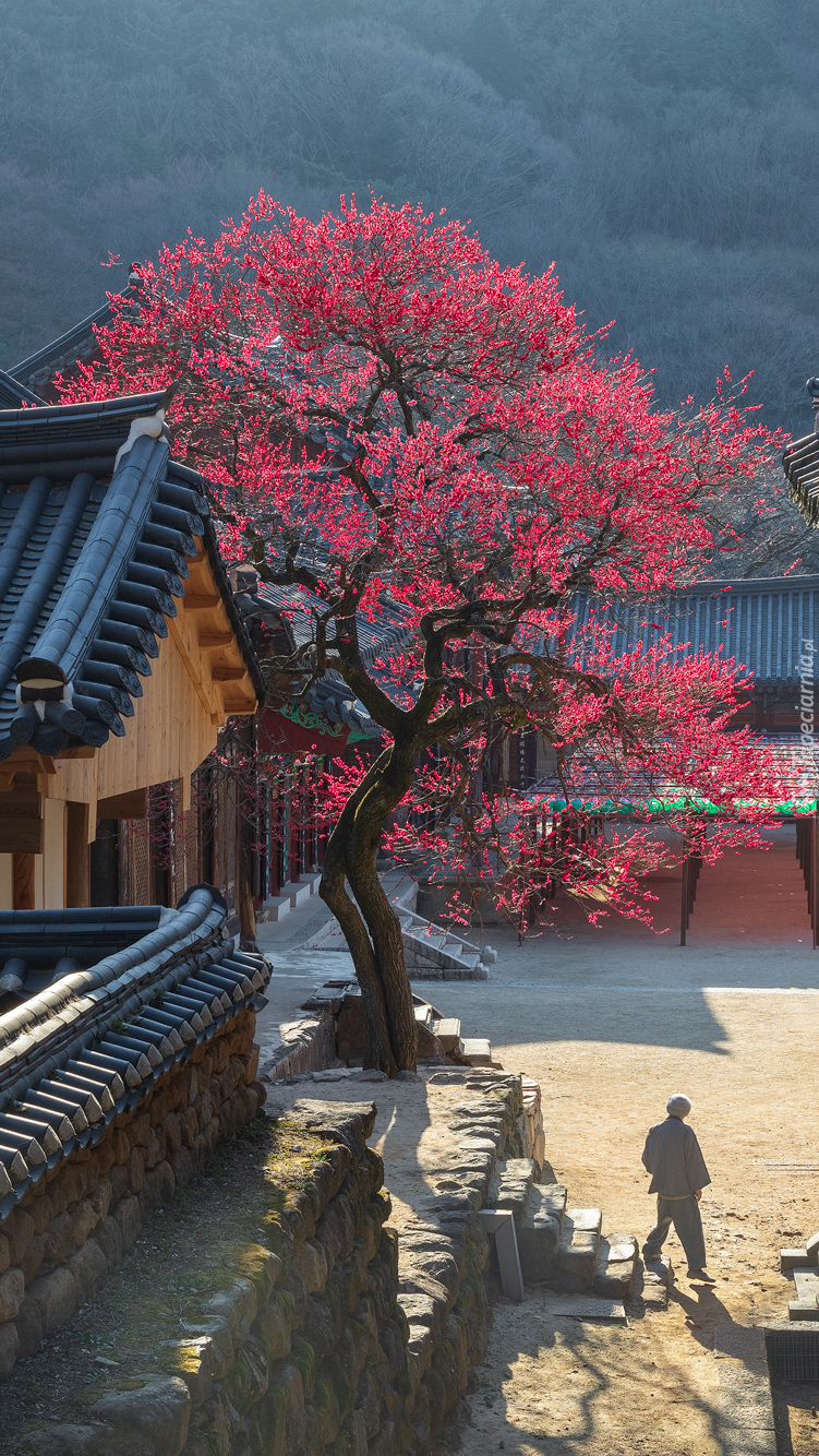 Edytor tapety: Kwitnące drzewo przed świątynią Hwaom sa