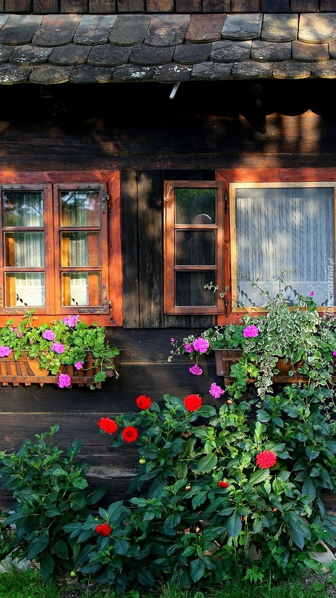 Edytor tapety: Kwiaty przed wiejskim domkiem