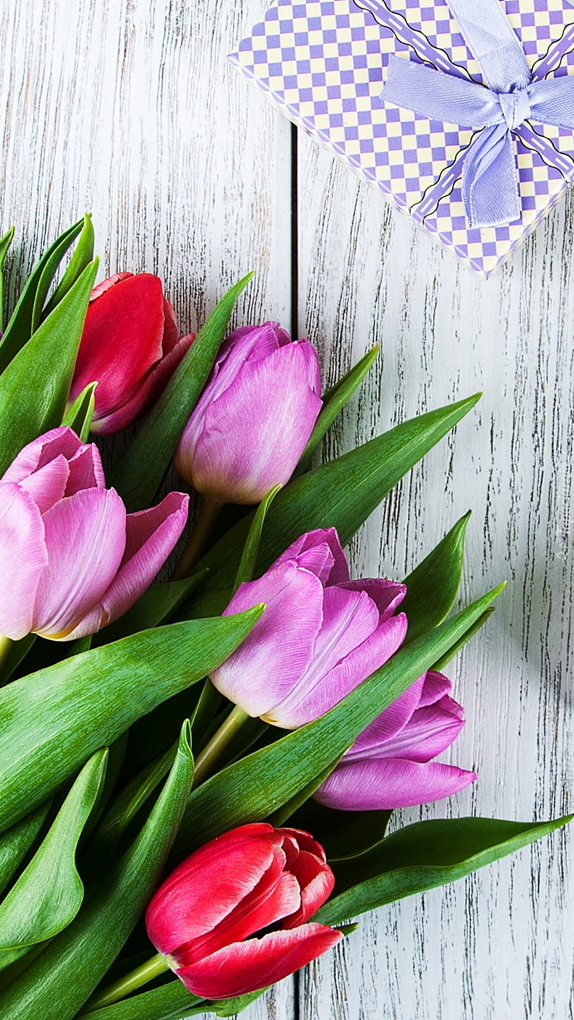 Edytor tapety: Prezent obok tulipanów