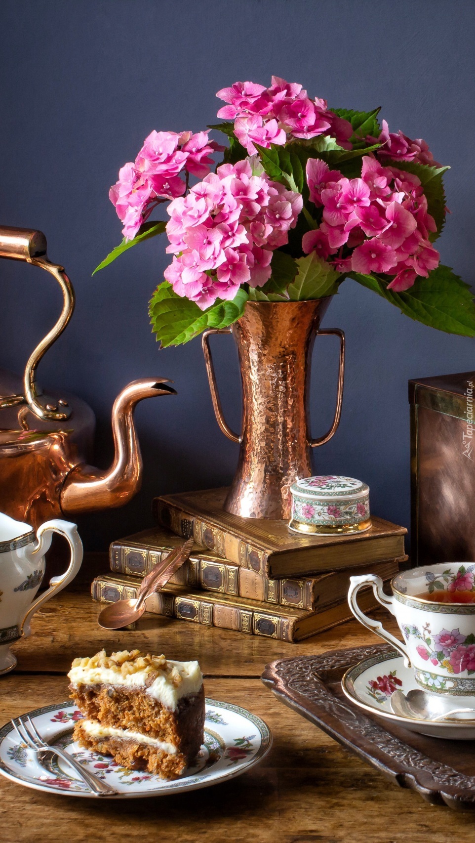 Edytor tapety: Bukiet hortensji na książkach