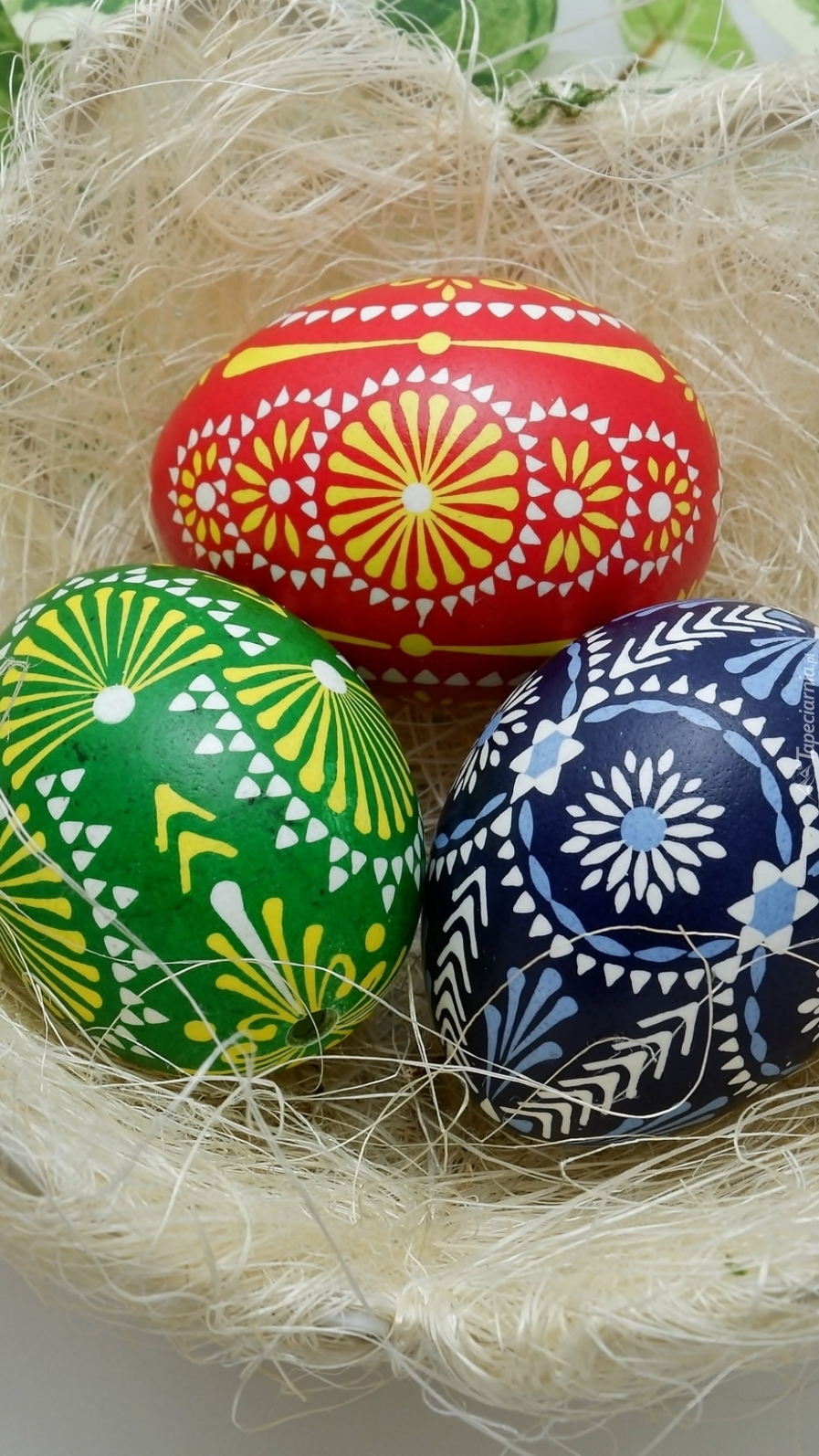 Edytor tapety: Trzy kolorowe pisanki w gniazdku