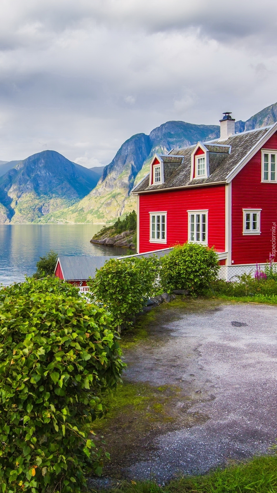 Edytor tapety: Czerwony dom przy fiordzie Sognefjorden
