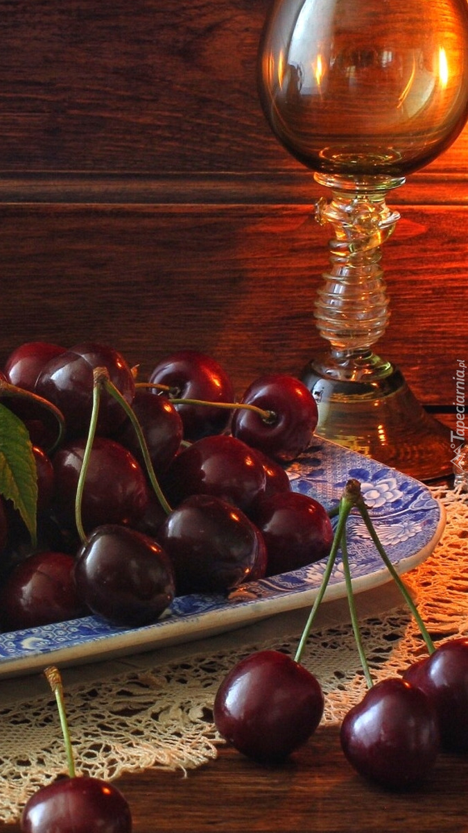 Edytor tapety: Czereśnie na półmisku obok kieliszka