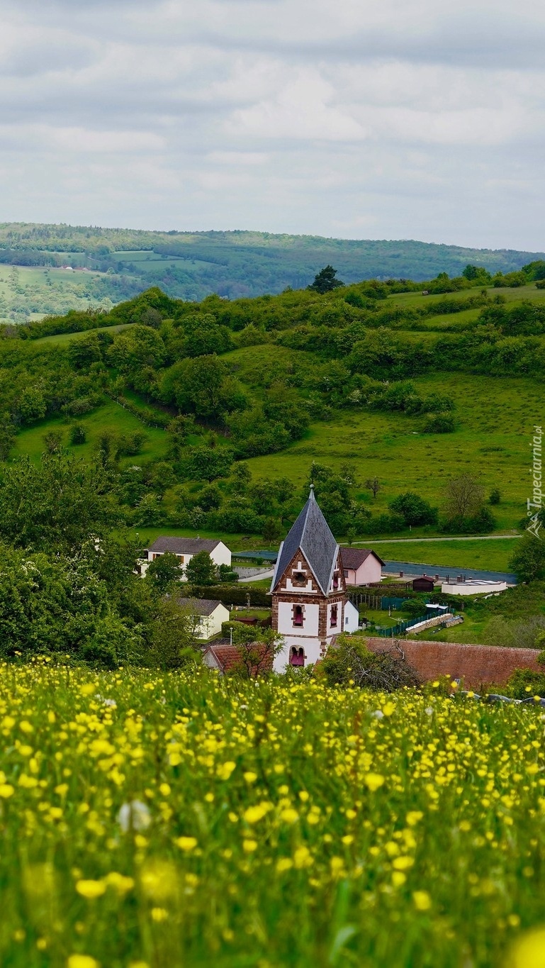 Edytor tapety: Kościół na tle zielonych wzgórz