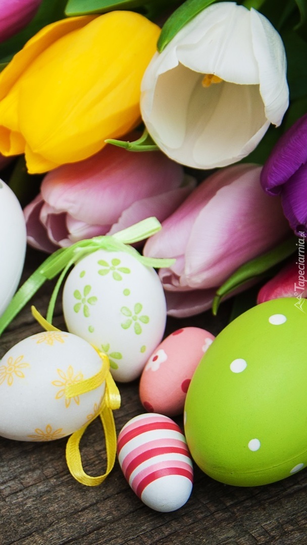 Edytor tapety: Kolorowe pisanki obok tulipanów