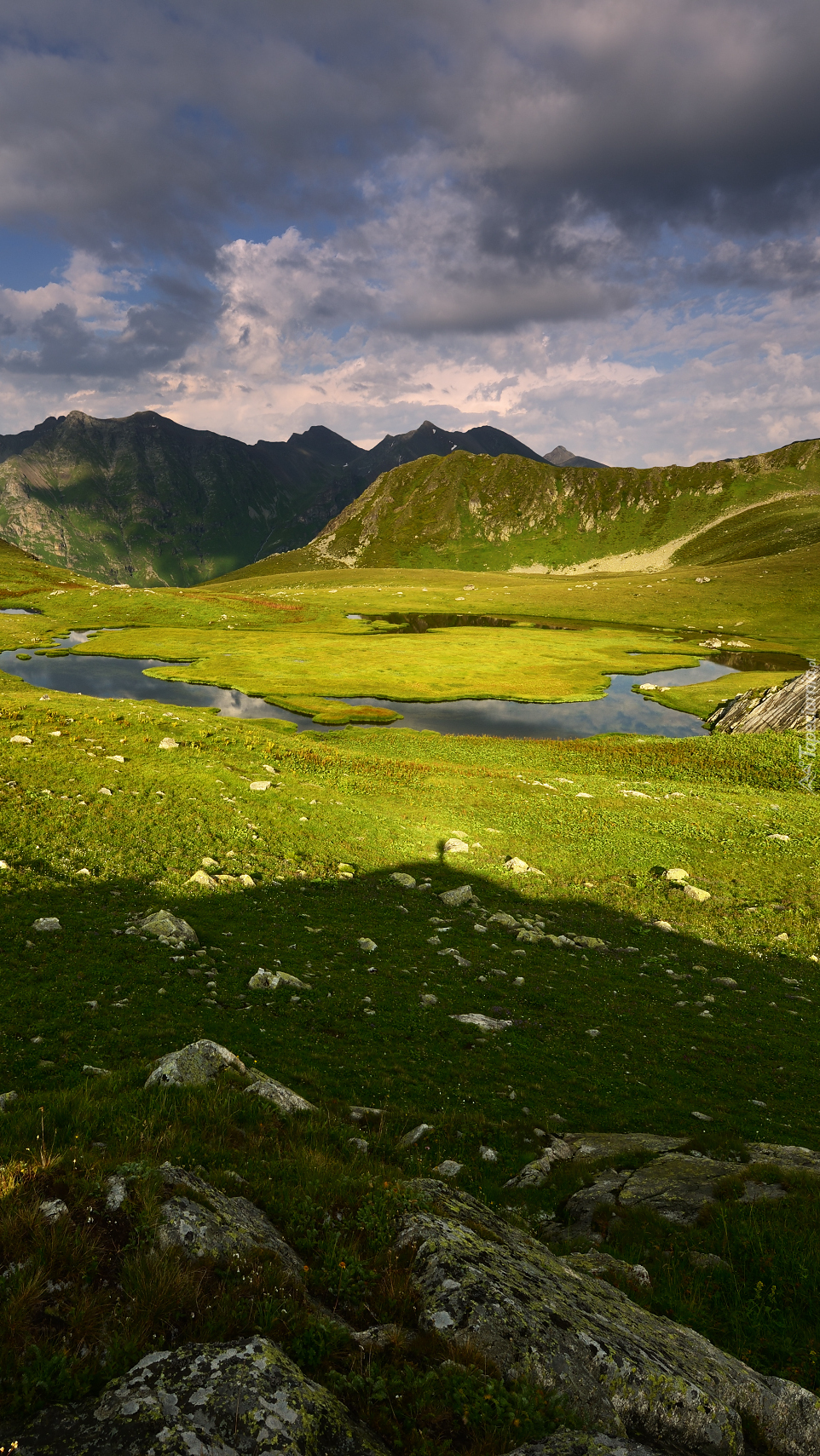 Edytor tapety: Zielone wzgórza nad jeziorem