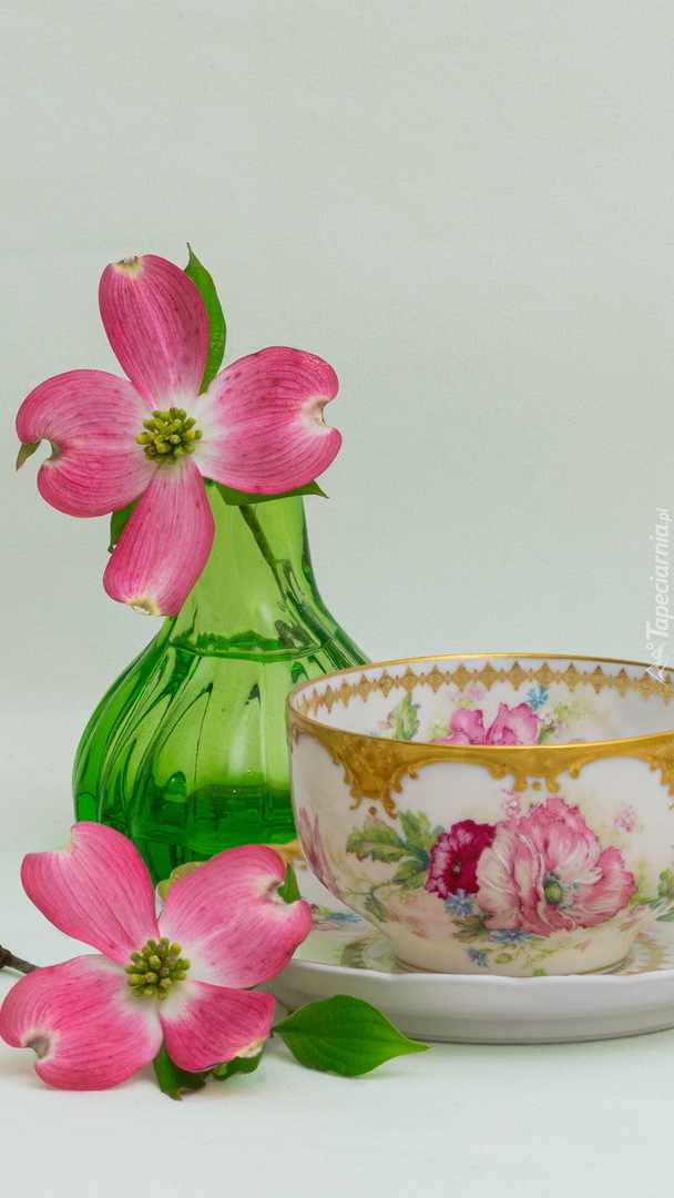Edytor tapety: Dereń w wazonie obok filiżanki
