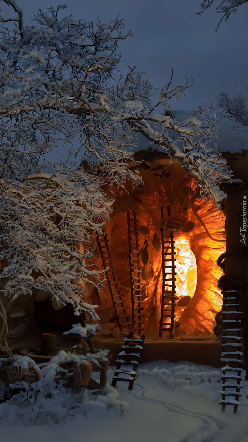 Edytor tapety: Domek oświetlony w lesie