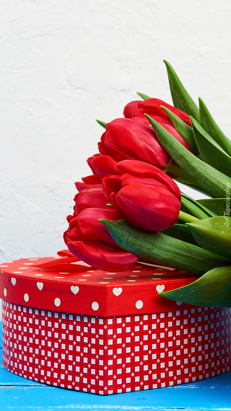 Edytor tapety: Czerwone tulipany na pudełku