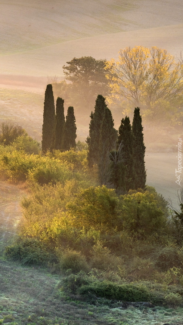 Edytor tapety: Drzewa na zamglonych polach Toskanii