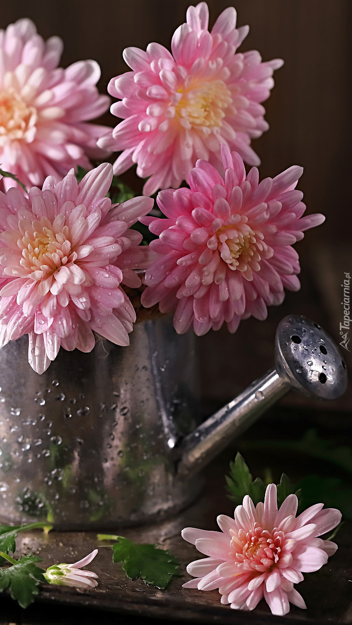 Edytor tapety: Różowe chryzantemy w konewce