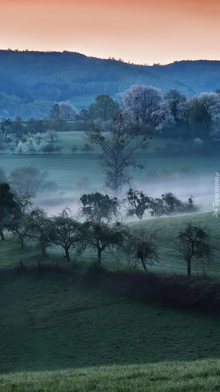 Edytor tapety: Zamglone drzewa na wzgórzach