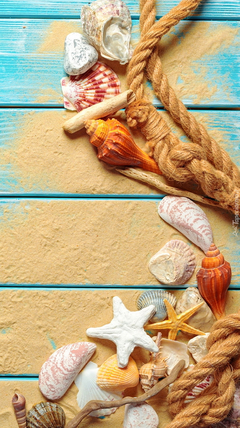Edytor tapety: Muszelki obok liny na piasku