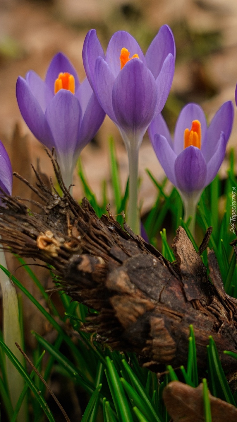 Edytor tapety: Trzy krokusy obok szyszki