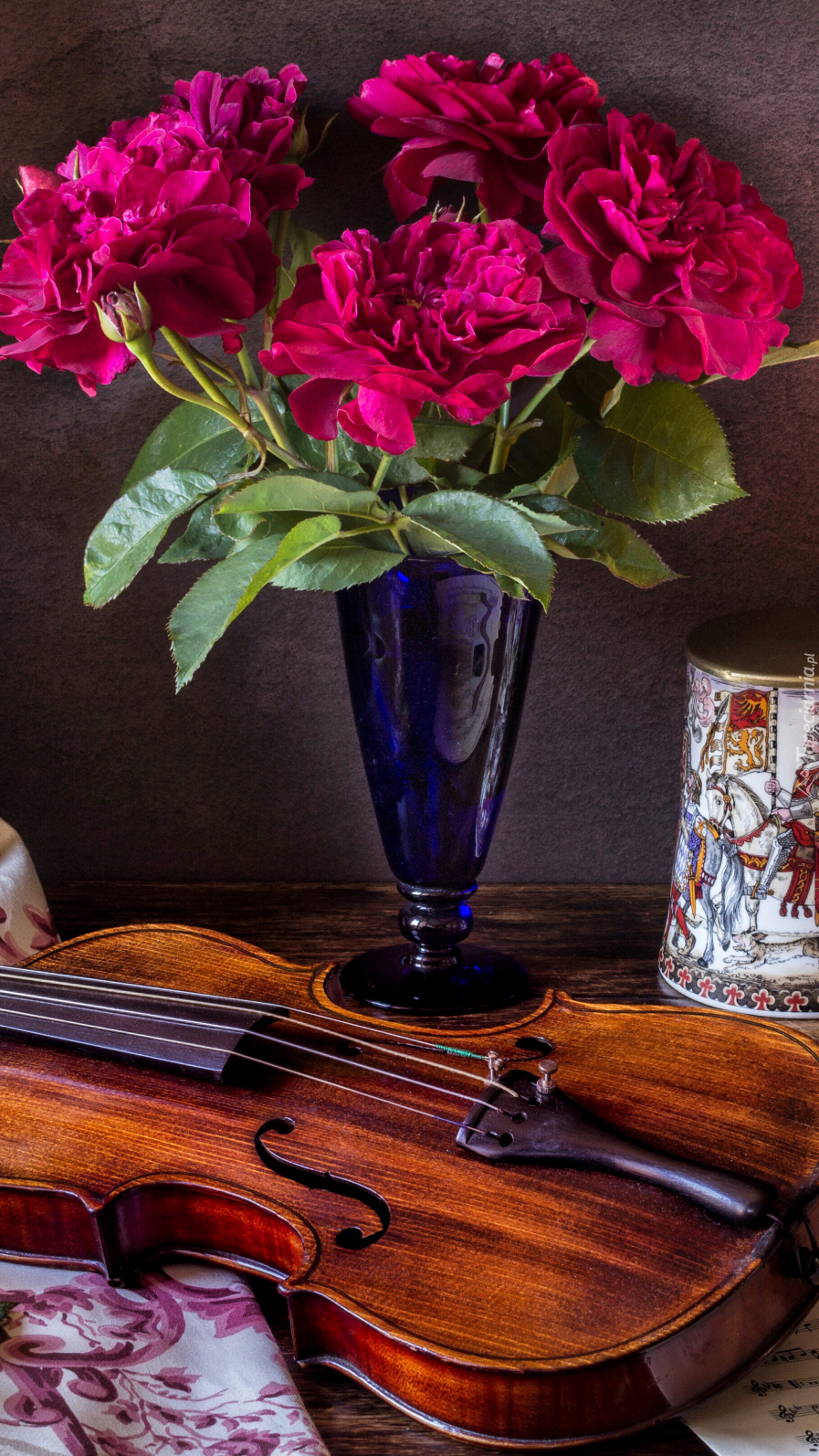 Edytor tapety: Flakon z kwiatami obok skrzypiec