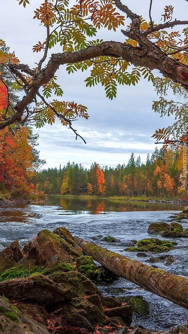 Edytor tapety: Konar drzewa nad skałami w rzece